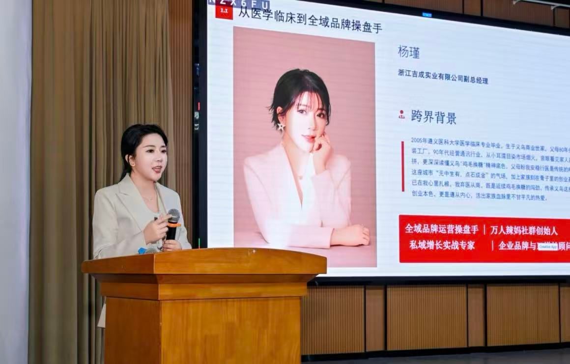 第二阶段义乌市女企业家协会会长大讲堂由义乌市女企业家协会常务副会长秦黄娣主持。浙江吉成实业副总经理杨瑾以《从“看见”到“点燃”:女性创业者的韧性、利他与共生之路》为题作精彩分享。杨瑾结合自身20年跨界创业经历,从实体通讯、社交营销、微商操盘到品牌运营,分享了对女性创业的深刻洞察。她提出:“生意的核心从来不是产品,而是信任;客户不是冰冷的流量数据,而是一个个需要被真诚对待的人。”同时,她深情讲述了浙江吉成实业有限公司董事长刘巧玲从19岁借款4000元创业起步,历经失败与挫折,最终带领企业实现跨越式发展的感人故事。